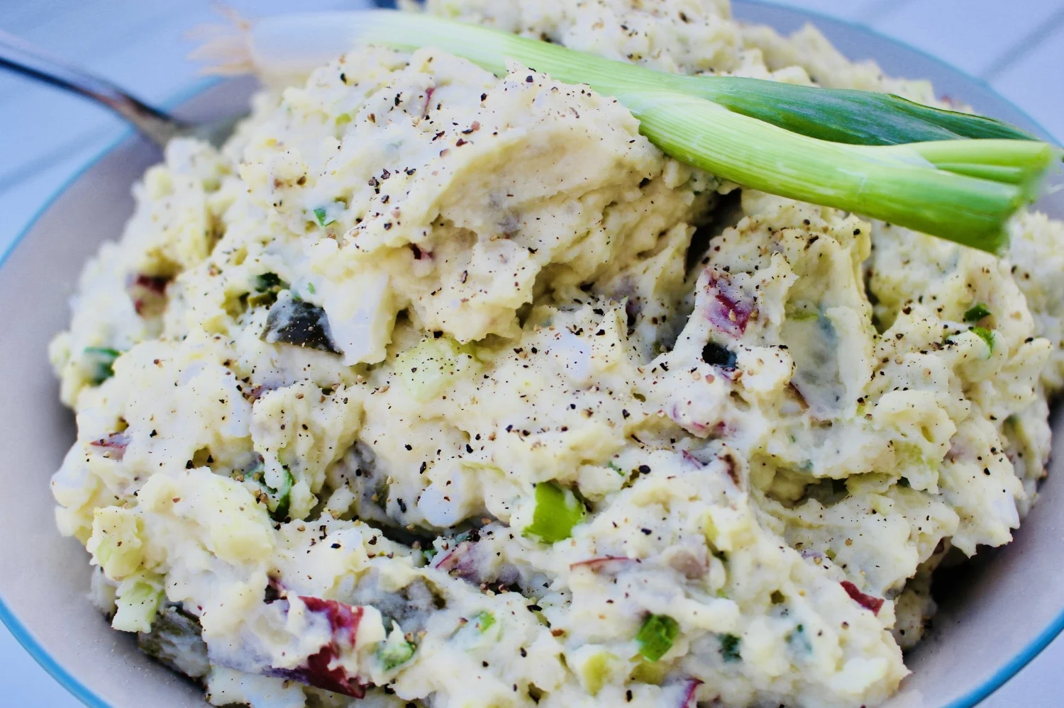 Chop the hardboiled eggs, celery, radish, pickles, and green onion.  Add to a large bowl and fold in the potatoes.